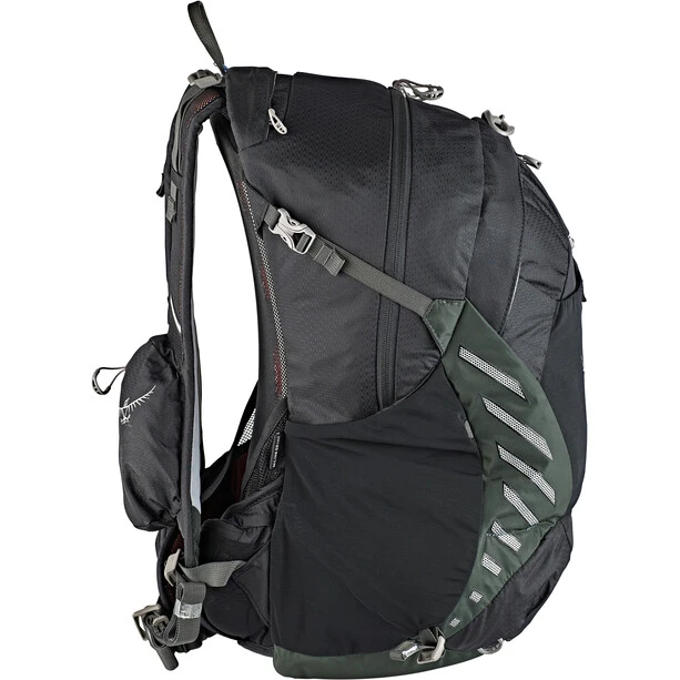 If after a hard day’s ride, the end of the trail is still blissfully unknown then you share the ‘single-track’ mind. This spirit of adventure is captured by the versatility of Osprey’s Escapist series. Whether you’re riding 100+ miles or commuting to work, the AirScape backpanel provides you with complete ventilation and support. Decided that today you’re going to tackle some downhill? When you’re thrashing those fast descents you’ll appreciate how the Biostretch hipbelt and harness keep the pack synched comfortably to your back. The Escapist’s twin zippered hipbelt pockets mean you can quickly grab trail essentials on the go and firmly attach your helmet with Lidlock. Keep your phone and sunglasses to hand with the scratch-free pockets in the harness and main compartment. The best rides inevitably result in dirty gear, store it separately with the Escapist’s internal zipped divider. Keeping yourself hydrated when riding hard is absolutely key, with quick access to the external hydration sleeve you can easily refill your reservoir. When you’re out riding over multiple days, you’ll need to carry enough kit. InsideOut compression and PowerMesh stretch pockets allow you to securely transport all your gear no matter how rutted the track you’re riding gets. An internal organiser means you can easily sort your tools, spares and pumps. Even when the weather turns for the worst, the built in high visibility raincover deploys quickly to protect your pack and all of your gear. Keep yourself visible in low light with reflective graphics and blinker light attachment.