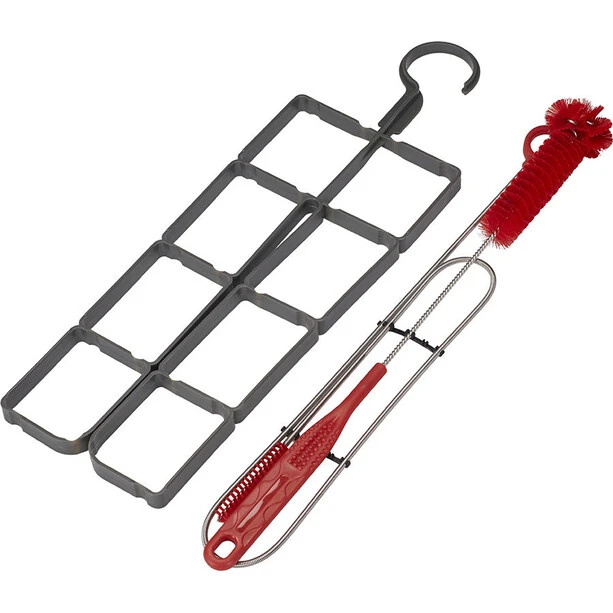 Keep your reservoir clean with the Osprey Hydraulics Cleaning Kit. Included with the kit is a ladder expander that holds the reservoir open to dry after use. Two specially designed brushes, one for the reservoir and one for the hose keep all the corners and channels in top condition. Everything you need for a happy reservoir comes packaged in a reusable cord lock mesh bag.